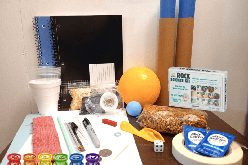 This kit does NOT include: a calculator, flashlight, desk lamp, scissors, water, vinegar, spoon, glass jars or cups, oven mitts, salt, paper towels, knife, textbooks, sheets of paper, plastic water bottles, tablespoon, small casserole dish, measuring cups, leaves, sticks, pepper, can of soup, large bowl, olive oil, ice, pens, pencils, ruler, colored pencils, eraser.