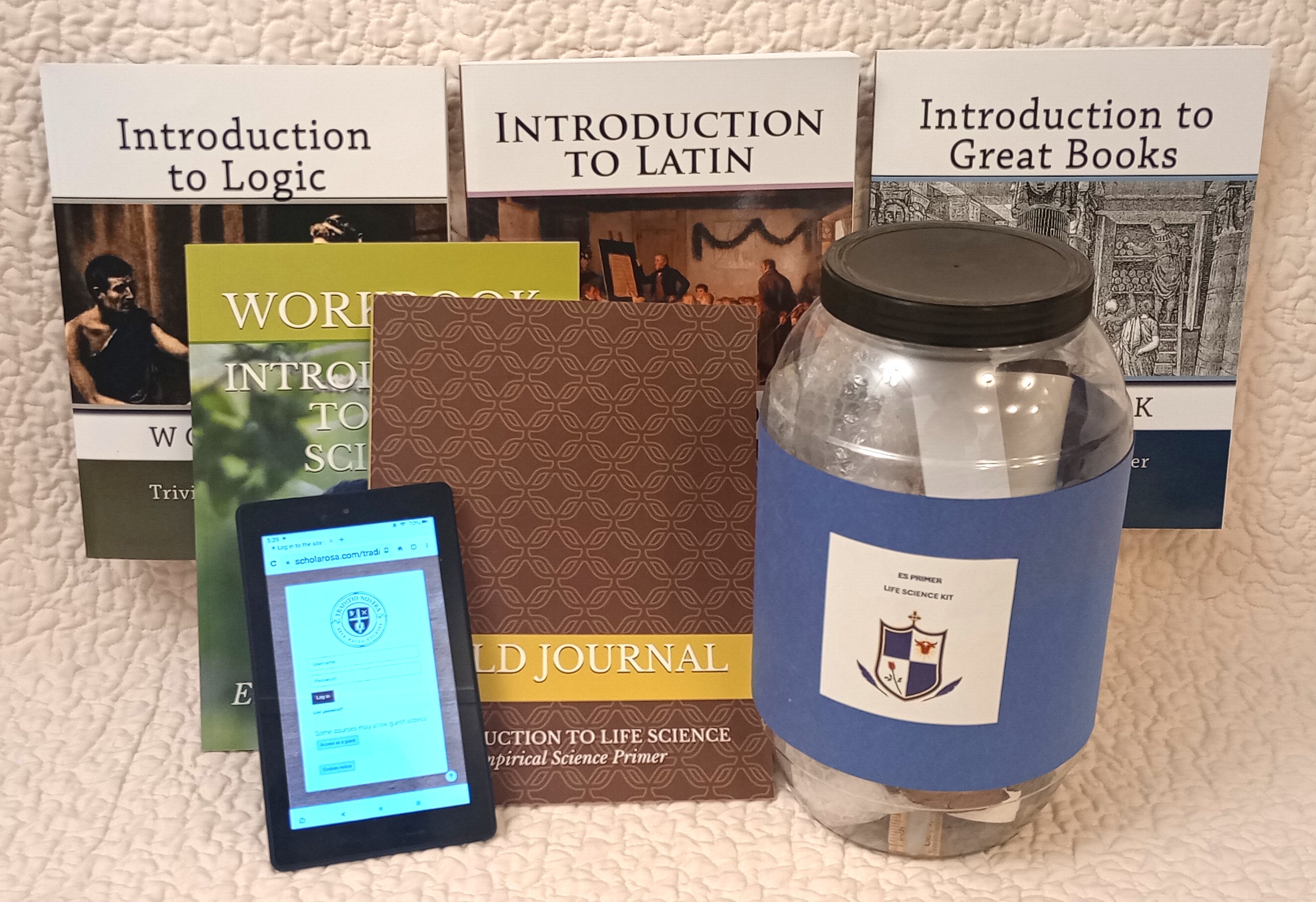 The Traditio Nostra 7th Grade ~ Self-Paced Workbooks and Materials with Subscription Bundle includes a digital subscription to the core subjects of the 7th grade year as taught at Oxrose Academy and the wrokbooks and supplies kits for those courses. The textbooks are not included.
