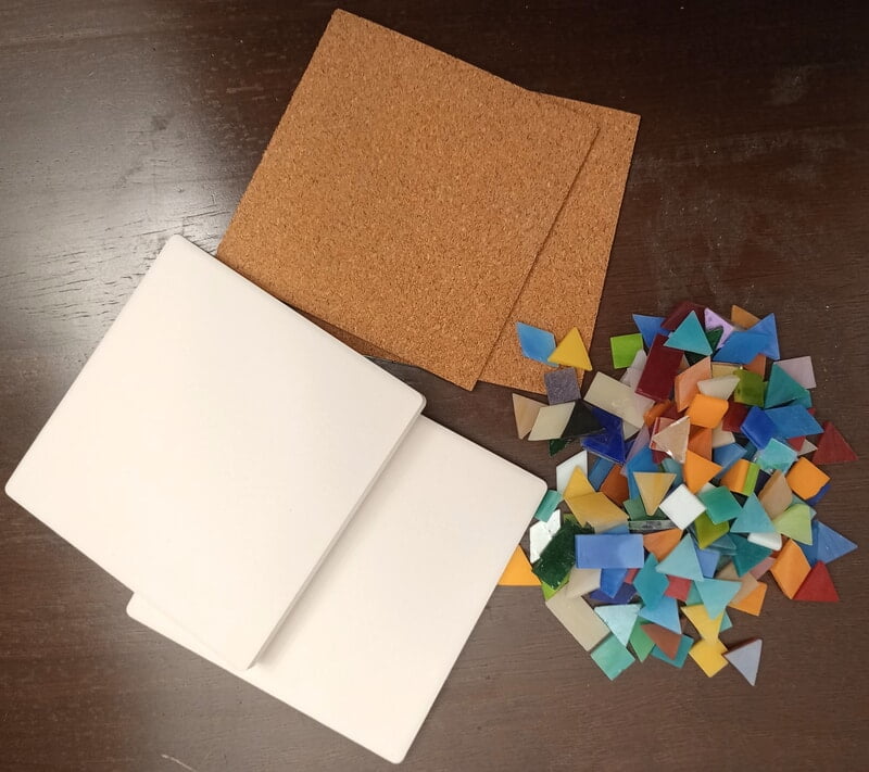 Includes two blank tiles on which to make the mosaic, a cork backing, and glass pieces in a variety of colors.