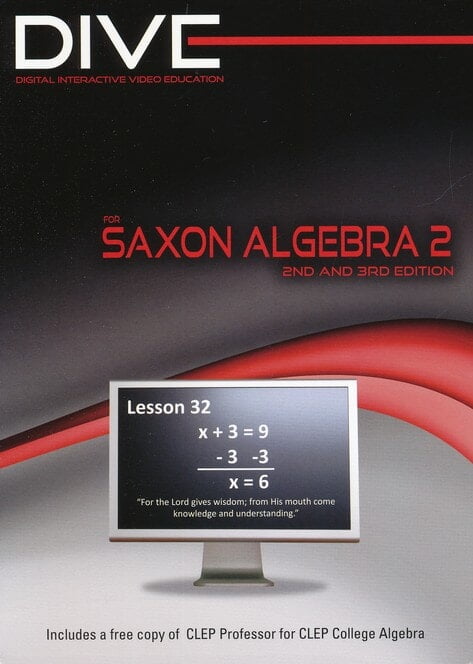 Algebra 2 covers traditional second year algebra topics as well as a semester of geometry, real world problems, linear and nonlinear equations, statistics and probability, graphing and basic trigonometry. This DIVE CD can be used with Saxon Algebra 2's 2nd and 3rd Editions; the CLEP Professor College Algebra CLEP Exam prep course is also included.