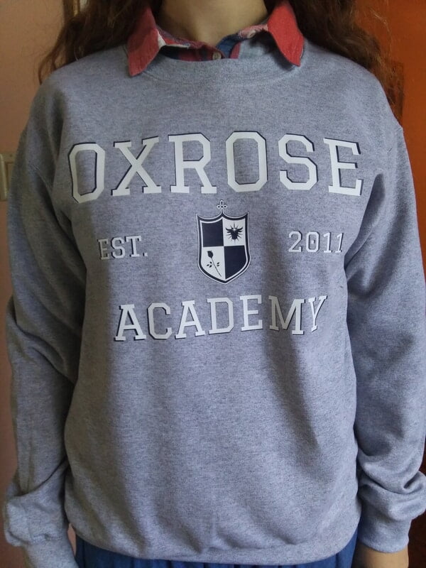 A grey pullover sweatshirt with the Oxrose crest and name in white and navy.