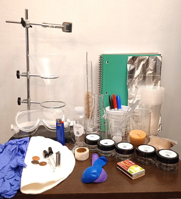 This Chemistry Materials Kit (Basic) includes everything in the Chemistry Materials Kit (Complete) except the Scientific Calculator, Digital Scale and Balance, and thermometer. One or the other kit is required for the ES 4-Chemistry class at Oxrose Academy.