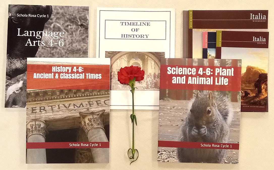The Schola Rosa 4-6 Workbooks - Cycle 1 are for fourth through sixth grade students completing the Schola Rosa Curriculum - Cycle 1. Workbooks included are: Little Latin Readers Set, Level 1; Little Latin Readers Set, Level 2; Science 4-6; Language Arts 4-6; History 4-6; and Timeline of History book.